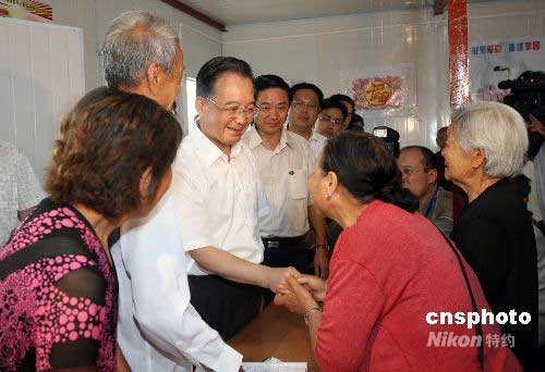 6月6日上午,國務(wù)院總理、國務(wù)院抗震救災(zāi)總指揮部總指揮溫家寶,四川綿陽居民疏散安置點,看望部分轉(zhuǎn)移安置群眾,并與安置點老人親切交談。中新社發(fā) 蒲滔 攝