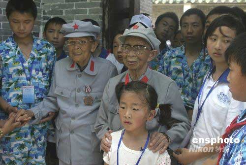 6月11日上午,海南瓊海市98歲王運梅(右二)和95歲王振梅(中)兩位紅色娘子軍,看望前來紅色娘子軍紀念園參觀的四川災區(qū)孩子,并祝愿孩子們健康快樂成長。中新社發(fā) 付美斌 攝