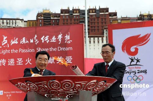 6月21日,奧運(yùn)火炬在西藏拉薩進(jìn)行傳遞。在傳遞終點(diǎn)布達(dá)拉宮廣場(chǎng)舉行的奧運(yùn)史上首次熔火儀式上,中共西藏自治區(qū)黨委書記張慶黎與西藏自治區(qū)主席向巴平措,分別將由登頂珠峰的火種和在境內(nèi)接力傳遞的火種點(diǎn)燃的兩支火炬,在圣火盆中相熔點(diǎn)燃。 中新社發(fā) 廖攀 攝
