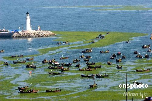 6月25日,2008北京奧運(yùn)會(huì)奧帆基地海域正在打撈滸苔。近日,青島海域滸苔泛濫,有關(guān)方面加緊打撈。中新社發(fā) 呼蘭江 攝