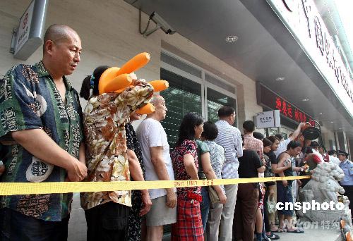 7月9日,北京,眾多市民在銀行門前排隊(duì)等候兌換奧運(yùn)紀(jì)念鈔。由央行發(fā)行的600萬張10元面額奧運(yùn)紀(jì)念鈔,9日與北京市民見面。北京市工商銀行、農(nóng)業(yè)銀行、中國銀行、建設(shè)銀行、交通銀行5家商業(yè)銀行約300個營業(yè)網(wǎng)點(diǎn)面向社會兌換紀(jì)念鈔,規(guī)定每人僅限兌換一張。許多市民甚至連夜排隊(duì)等候。中新社發(fā) 盛佳鵬 攝