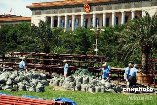 7月12日,天安門廣場正在布置花壇,預(yù)計將擺放100萬盆鮮花,形成以“中國印·舞動的北京”為主景的花海。奧運(yùn)會期間,天安門廣場和京城主要街道將擺放1500萬盆鮮花。廣場花壇將跨越奧運(yùn)會、殘奧會和國慶節(jié),自夏至秋持續(xù)三個多月。這是自1986年天安門廣場開始擺花以來時間最長的一次。中新社發(fā) 楊慧峰 攝