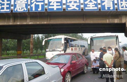 京津高速安全行駛標(biāo)語下的車禍。7月18日18點,在天津通往北京的高速公路上,3輛轎車、1輛大巴車、1輛滿載乘客的機(jī)場大巴車追尾相撞,事故無人傷亡,但造成交通堵塞,公安交警及時趕到進(jìn)行了處理。中新社發(fā) 錢興強 攝