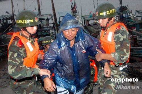 7月18日傍晚,2008年第7號臺風(fēng)“海鷗”登陸前,浙江省溫州市龍港鎮(zhèn)有四名漁民困在漁船上無法撤離。溫州邊防支隊抗臺搶險分隊官兵火速趕赴救援,成功將他們安全轉(zhuǎn)移上岸。中新社發(fā) 吳水斌 攝