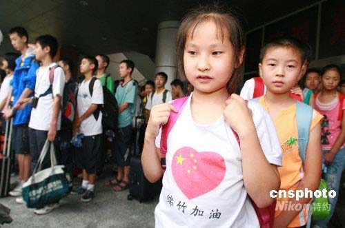 7月21日,四百余名來(lái)自四川、重慶、陜西、甘肅等地震重災(zāi)區(qū)的中小學(xué)生抵達(dá)陜西省西安市,參加將于7月21日至29日舉行的“情系汶川——中外青少年心連心夏令營(yíng)”活動(dòng)。此次夏令營(yíng)由國(guó)務(wù)院僑務(wù)辦公室主辦,組織來(lái)自地震的中小學(xué)生將與來(lái)訪的國(guó)外及華裔青少年進(jìn)行交流聯(lián)歡活動(dòng)。圖為來(lái)自四川綿竹的學(xué)生抵達(dá)西安。中新社發(fā) 廖文靜 攝