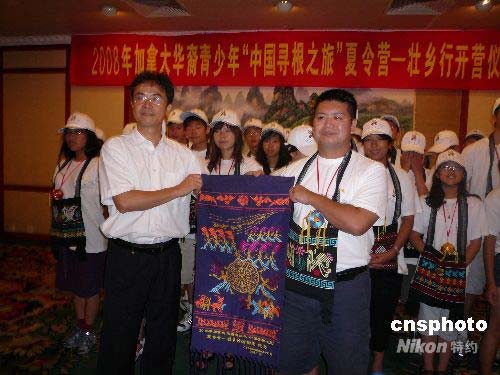 7月25日,由39名加拿大華裔青少年組成的“中國尋根之旅”夏令營在國際旅游名城桂林開營,廣西區(qū)僑辦官員給夏令營增送壯族禮物“壯錦”。據(jù)介紹,此次為期9天的夏令營活動(dòng)是由中國國務(wù)院僑務(wù)辦公室主辦,廣西區(qū)僑辦承辦,夏令營成員將游覽廣西桂林、南寧、北海3個(gè)旅游城市,學(xué)習(xí)中國文化常識,了解廣西民族民俗風(fēng)情。中新社發(fā) 周利朔 攝