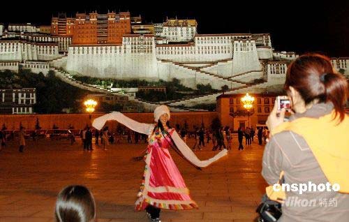 7月26日,游客在布達(dá)拉宮廣場上拍照留念。7月的拉薩綠樹成蔭,鮮花錦簇,在明媚的陽光下,來自世界各地的游客云集,拉薩又到旅游旺季,已經(jīng)走出“3.14”打砸搶燒暴力事件的陰影。據(jù)估計,7月份開放入境游,當(dāng)月旅游人數(shù)將達(dá)到35萬人次。中新社發(fā) 周波 攝