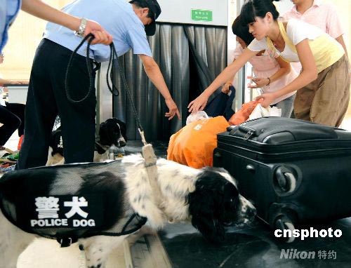為確保二00八北京奧運會青島奧帆賽的安全,青島火車站鐵路公安處引進德國邢偵犬、比利時緝毒犬、英國搜爆犬等犬種,對客貨物品進行嚴格檢查,在青島火車站廣場上巡邏盤查可疑人員。圖為旅客進站物品通過安檢后搜爆犬再次把關。 中新社發(fā) 曲連遵 攝