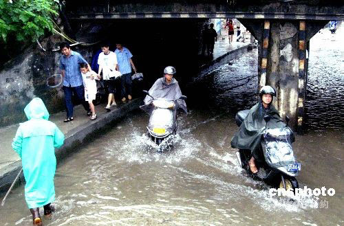 7月29日,受臺風(fēng)“鳳凰”帶來強(qiáng)降雨的影響,福州一低洼地帶積水仍未退去,為市民出行帶來不便。中新社發(fā) 劉可耕 攝