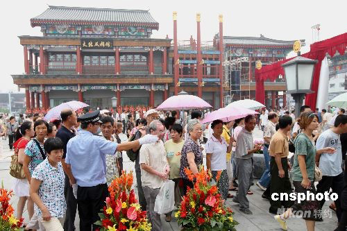 8月7日,眾多北京市民及外地游客在警察的疏導(dǎo)下,有次序地參觀改造后的北京前門大街。當(dāng)日,北京前門大街正式對外開放。經(jīng)過2年多的擴(kuò)建、改造,老牌樓、有軌電車、老字號店鋪重現(xiàn)老北京時的風(fēng)貌。中新社發(fā) 史利 攝