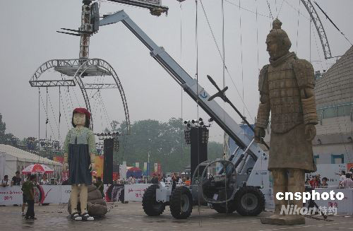 8月11日,《勇士和女孩》巨型木偶劇在在北京中華世紀(jì)壇奧運活動現(xiàn)場出演。主角是兩個高達22英尺(約6.7米)的提線木偶,演繹一個中國女孩和秦始皇兵馬俑之間的溫馨故事,通過古代與現(xiàn)代、智慧與天真兩個迥乎不同的形象突出了戲劇效果,體現(xiàn)了關(guān)愛、善良和友誼永恒等精神價值。中新社發(fā) 九州 攝