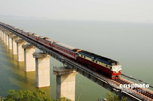 9月2日下午,一列客車從鄱陽湖鐵路特大橋上向九江駛?cè)ァ.斕,旅客列車首次通過鄱陽湖。自9月1日起,銅九鐵路先后開行南昌至南京、南昌至寧波、南京至武昌等方向旅客列車,江西境內(nèi)湖口、彭澤2個縣城從此結(jié)束不通旅客列車的歷史。據(jù)了解,客車開行后,從九江至南京比目前縮短近10個小時,從南昌至南京也比目前縮短近5個小時,南昌至寧波需繞道杭州的歷史結(jié)束,旅客出行更加方便、快捷。圖為9月2日16:45分左右,K506次南京至南昌旅客列車從鄱陽湖鐵路特大橋上駛過。中新社發(fā) 胡國林 攝