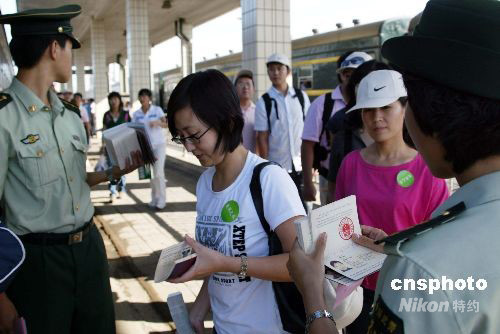 9月8日下午,來自全國各地的近100名赴朝鮮參加四日游的游客從丹東火車站登上丹東至新義洲的旅游專列。隨著朝鮮作為旅游目的地國的政策的推進,加之八九月份朝鮮“阿里郎”旅游項目的增加,赴朝旅游的中國公民數(shù)量不斷上升。丹東邊檢積極應(yīng)對,保證游客安全順利通關(guān);而丹東市九家擁有辦理赴朝鮮旅游資格的旅行社也正積極準備,迎接明年開始的大規(guī)模赴朝游活動。中新社發(fā) 陳浩浩 攝
