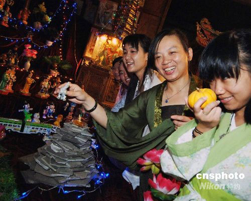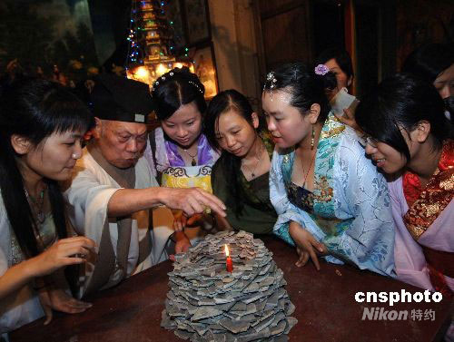9月13日,五十多名福建漢服愛好者在福州名勝裴仙宮舉行擺塔慶中秋,重現(xiàn)福州民俗。據(jù)傳“擺塔”源于明嘉靖年間戚繼光奉命來閩抗倭,連打幾場大勝戰(zhàn)。有一次正逢中秋節(jié),為慶祝勝利,人們把古玩等擺在廳堂供人欣賞。過去福州的塔比較多,擺設品多為古塔狀,故稱“擺塔”。中新社發(fā) 劉可耕 攝