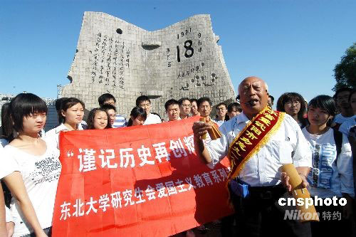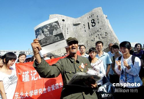 9月18日,許多當(dāng)年抗日戰(zhàn)士、“九一八”事變受害者,紛紛聚集在遼寧沈陽“九一八”歷史博物館殘歷碑前,訴說慘痛歷史,對年輕一代進(jìn)行愛國主義教育。中新社發(fā) 文契 攝