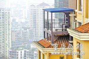 32樓的高空竟搭建起一個近20平米的陽臺(如圖)。除了驚嘆,網(wǎng)友們戲稱之為“重慶最牛陽臺”、“重慶第九奇跡建筑”。