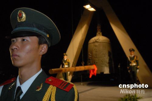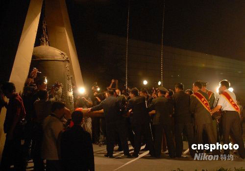 2008年9月18日晚九點(diǎn)十八分,遼寧沈陽市在九一八事變事發(fā)地舉行隆重的撞鐘儀式。警鐘長鳴,勿忘國恥。中新社發(fā) 孫海 攝