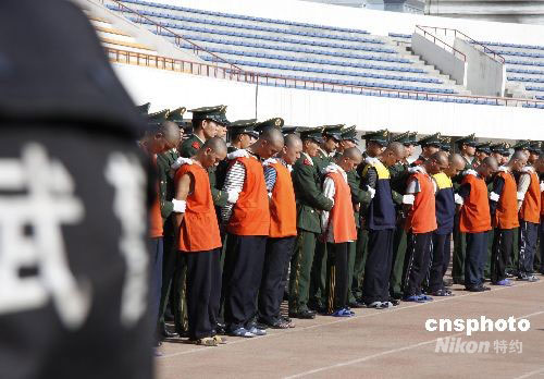 9月18日中午11時(shí),新疆伊犁州公、檢、法等部門在伊寧市體育場(chǎng)舉行公捕公判大會(huì)。公判大會(huì)上,新疆自治區(qū)高級(jí)人民法院伊犁州分院對(duì)買買提艾力.阿不都熱合曼等12名犯罪分子進(jìn)行公開宣判,對(duì)艾力.庫那洪等12名危害國(guó)家安全及嚴(yán)重?cái)_亂社會(huì)秩序的犯罪嫌疑人公開執(zhí)行逮捕。中新社發(fā) 李志剛 攝