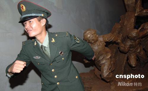9月20日下午,一名解放軍士兵在北京中國(guó)人民革命軍事博物館參加“‘萬眾一心 眾志成城’--抗震救災(zāi)主題展覽”開幕活動(dòng)后,在觀展時(shí)即興在《人民教師》雕像擺奮勇拼搏的造型拍照留影。該展覽是由中共中央宣傳部、國(guó)家發(fā)展和改革委員會(huì)、解放軍總政治部共同主辦的,將于9月21日正式對(duì)公眾開放。此展為汶川大地震后,北京舉辦的反映抗震救災(zāi)工作,規(guī)模最大,文物最多,圖片形象最為詳盡的展覽之一。中新社發(fā) 鄒憲 攝