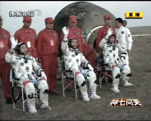 9月28日,神舟七號飛船返回艙順利著落,三名航天員翟志剛、劉伯明、景海鵬在經(jīng)過15-20分鐘的重力再適應(yīng)后全部出艙。首先出艙的是翟志剛,第二個出艙的是劉伯明,第三個出艙的是景海鵬。