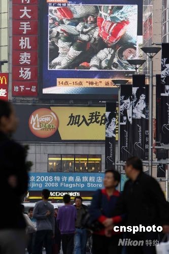 9月28日,神舟七號(hào)飛船返回艙順利著陸,北京市民在街頭觀看現(xiàn)場直播。中新社發(fā) 杜洋 攝