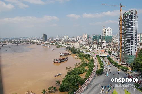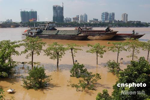 9月29日,邕江(珠江上游)8年以來最大洪峰通過廣西南寧,沿江兩岸大堤下許多樹木和路燈被淹沒。今年第14號(hào)臺(tái)風(fēng)“黑格比”盡管已經(jīng)遠(yuǎn)離消失,但給廣西帶動(dòng)來的影響最近幾天仍在繼續(xù),江河水位不斷上漲。南寧市邕江水位當(dāng)天下午2點(diǎn)前后達(dá)到75.83米,超警戒水位2.86米,為2001年以來的最大洪峰。中新社發(fā) 劉萬強(qiáng) 攝