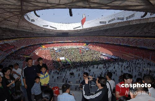 9月30日,“十一”國慶長假第二天,旅游黃金周進(jìn)入高潮,到北京旅游的各地游客都渴望進(jìn)入北京奧運(yùn)會主體育場“鳥巢”,有幸購到參觀票的游客在鳥巢盡情玩耍拍照。 中新社發(fā) 鄒憲 攝
