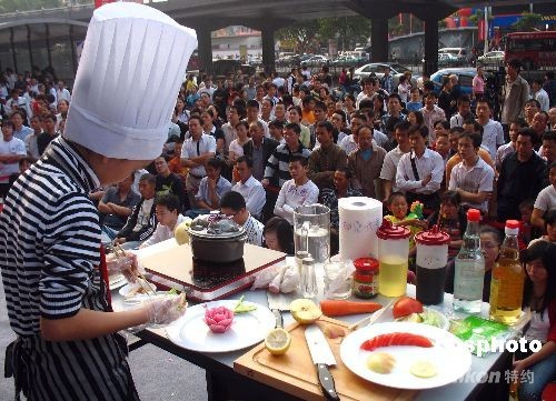 2008年10月1日,武漢市漢口航空路一廚藝大賽現(xiàn)場,11歲女童余秋萍上臺(tái)和成年人一起比賽烹調(diào)技藝。據(jù)了解,小學(xué)生余秋萍從9歲就開始學(xué)習(xí)廚藝,經(jīng)常在家炒菜做飯,認(rèn)為自己的手藝不錯(cuò),就報(bào)名參加了這次比賽。中新社發(fā) 孫新明 攝