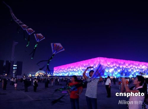 北京市民在十一國慶長假夜晚,在北京奧運(yùn)會(huì)主游泳館國家游泳中心“水立方”外放飛風(fēng)箏。中新社發(fā) 賈國榮 攝