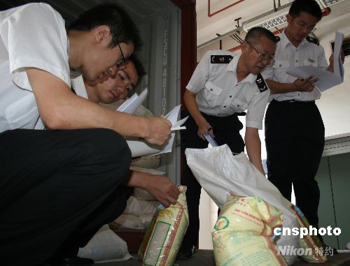 10月9日,參展第五屆中國—東盟博覽會的首批貨物順利抵達南寧。該批貨物為來自柬埔寨的大米、酒和木制家具等,廣西出入境檢驗檢疫局和南寧海關(guān)在確保對疫病疫情有效監(jiān)管的前提下,實行“聯(lián)合辦公、共同查驗、一站式服務(wù)”的工作機制,迅速為展品辦理通關(guān)手續(xù)。中新社發(fā) 林艷華 攝