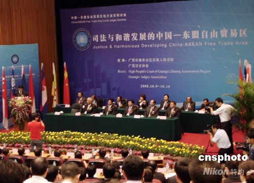 十月九日,中國—東盟自由貿(mào)易區(qū)地方法官研討會(huì)在廣西南寧開幕。來自柬埔寨、老撾、緬甸、新加坡等東盟國家及中國的八十余位高級(jí)官員、資深法官和法律實(shí)務(wù)工作者,以“司法與和諧發(fā)展的中國-東盟自由貿(mào)易區(qū)”為主題,圍繞民商事審判法律與實(shí)務(wù)、司法協(xié)助、法官培訓(xùn)與交流等進(jìn)行探討和交流。 中新社發(fā) 黃艷梅 攝