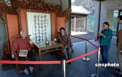 10月10日,免費進(jìn)入北京奧林匹克公園及老舍茶館“瓦院”參觀的游客,反客為主,在這座北京三進(jìn)制四合院中,東坐坐、西坐坐,并在正堂上就座拍照留影,感受老北京文化。中新社發(fā) 鄒憲 攝