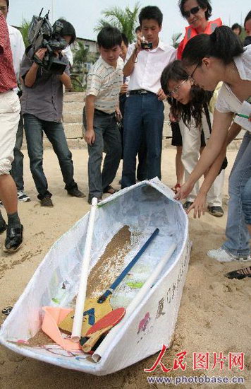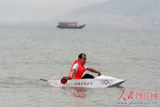 2008年10月13日上午,“紙船載人漂流第一人”朱亞林搭乘著自己親手打造的紙船下水開始試航。在使用乒乓球拍當(dāng)做雙槳航行大約五百米后,朱亞林順利靠岸,完成試航。