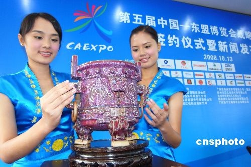 10月13日,由河南禹州孔家鈞窯燒制的2008中國(guó)—東盟博覽會(huì)鈞瓷國(guó)禮《象天鼎》運(yùn)抵廣西南寧,作品由中國(guó)工藝美術(shù)大師孔相卿設(shè)計(jì),以中國(guó)古老的青銅禮器“鼎”為基本造型設(shè)計(jì)制作,表達(dá)了中國(guó)與東盟國(guó)家互利合作、共享繁榮的美好愿望。據(jù)悉,第五屆中國(guó)—東盟博覽會(huì)將于10月22日—25日在中國(guó)廣西南寧舉行,《象天鼎》將作為國(guó)禮,贈(zèng)送給參加博覽會(huì)的各國(guó)政要。中新社發(fā) 牛書(shū)培 攝