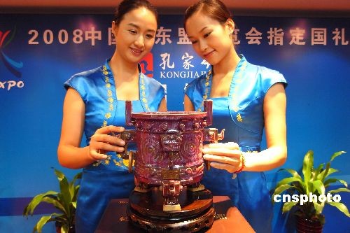 10月14日,廣西南寧舉行的中國—東盟博覽會新聞發(fā)布會宣布,產(chǎn)于河南禹州孔家鈞窯的鈞瓷《象天鼎》被確定為第五屆中國—東盟博覽會國禮。《象天鼎》由中國工藝美術(shù)大師孔相卿設(shè)計,以中國古老的青銅禮器“鼎”為基本造型設(shè)計制作,表達(dá)了中國與東盟國家互利合作、共享繁榮的美好愿望。中新社發(fā) 牛書培 攝