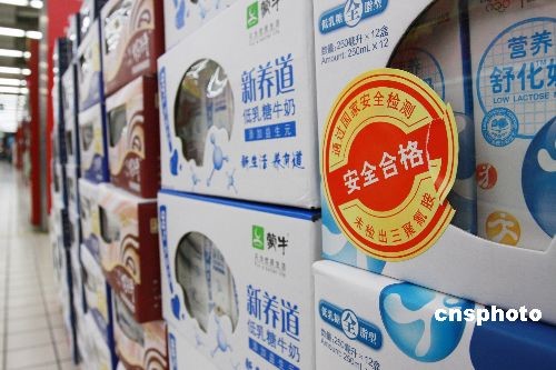 10月16日,北京一度下架的個(gè)別品牌液態(tài)奶,經(jīng)權(quán)威機(jī)構(gòu)檢驗(yàn)合格后,貼上安全合格標(biāo)識(shí)重新上架銷(xiāo)售。目前“下架奶”生產(chǎn)廠(chǎng)家已經(jīng)將重新檢驗(yàn)且合格的批次報(bào)告?zhèn)鬟_(dá)到超市,被檢產(chǎn)品則“仍在廠(chǎng)內(nèi)加緊貼上象征合格的綠色統(tǒng)一標(biāo)識(shí)”,預(yù)計(jì)蒙牛、伊利等品牌液態(tài)奶最遲會(huì)于17日重新回到零售終端。中新社發(fā) 鄭雄增 攝