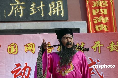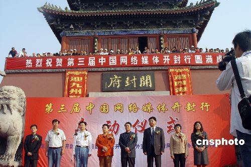 十月十七日,第三屆“中國(guó)網(wǎng)絡(luò)媒體開封行”啟動(dòng)儀式在當(dāng)年包公執(zhí)掌的開封府前隆重舉行。開封是歷史悠久的文化名城,是中國(guó)八大古都之一。戰(zhàn)國(guó)時(shí)期的魏國(guó),五代時(shí)期的后梁、后晉、后漢、后周以及北宋和金七個(gè)王朝曾先后建國(guó)都于開封,故稱“七朝都會(huì)”。中新社發(fā) 李志全 攝