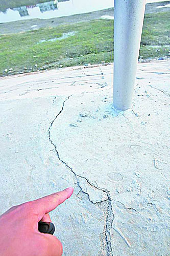 河省防汛嚴(yán)峻程度上,黃河排在第一位,沙潁河居第二位。周口地區(qū)的沙潁河段為“豆腐腰”,為讓“豆腐腰”挺起“腰桿”,國家對(duì)沙潁河近期防洪按20年一遇標(biāo)準(zhǔn)進(jìn)行治理。令人驚詫的是,沈丘縣城區(qū)沙潁河段剛完工的防洪堤壩“弱不禁風(fēng)”,一場(chǎng)雨竟沖毀了坡長為48個(gè)臺(tái)階、長約200米的防洪堤壩,防洪堤肩最深垂直坍陷2米,防洪墻下的灰土襯層,用腳輕輕一踩就粉碎,總長不到兩公里、寬3米的防洪堤肩,裂縫縱橫。