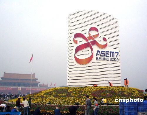 2008年10月20日,北京第七屆亞歐首腦會議標識在天安門廣場亮相,園林工人正在加緊進行花壇的完善工作。據(jù)悉,第七屆亞歐首腦會議將于10月24日至25日在京舉行。中新社發(fā) 玉龍 攝
