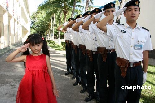 10月21日下午,在北京奧運(yùn)開(kāi)幕式上一曲成名的小女孩林妙可,利用參加三亞城市精神評(píng)選活動(dòng)暨奧運(yùn)冠軍三亞行晚會(huì)之際,來(lái)到海軍駐南國(guó)三亞某保障基地標(biāo)桿式單位警勤邊參觀。到該連后,林妙可在趙勛兵副連長(zhǎng)的帶領(lǐng)下,參觀了連隊(duì)內(nèi)務(wù)、健身房、榮譽(yù)室。中新社發(fā) 郜宏亮 攝