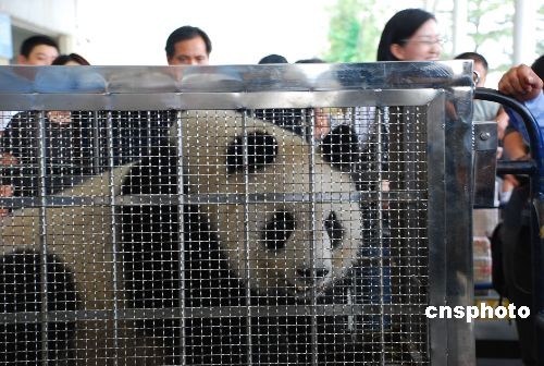 10月22日,兩只國寶級大熊貓“樂山”、“珍大”抵達杭州蕭山國際機場,立即乘車去它們的新家——浙江安吉竹博園落戶。據(jù)飼養(yǎng)員史斌遞介紹,這兩只大熊貓來自四川成都大熊貓繁育研究基地,均為雄性,每只重約100公斤,年齡都大約在兩歲半左右,相當(dāng)于人類的八九歲。它們都很好動,愛爬樹,是熊貓家族里的“運動健將”。中新社發(fā) 夏毅 攝