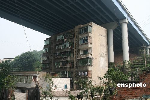圖為重慶渝黔高速路南山立交橋下的一幢6層居民樓,此樓樓頂立交橋,背倚橋柱,在網(wǎng)上被稱(chēng)為“終年曬不到太陽(yáng)、淋不到雨的最牛的樓房”。而近日這棟“最牛樓房”還未拆遷,旁邊卻又要開(kāi)建新房,引起了廣大市民的熱議。中新社發(fā) 孫須 攝