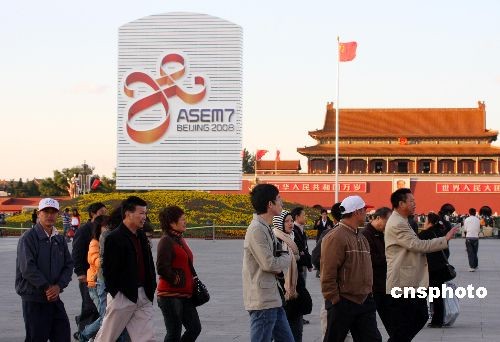 10月23日,北京天安門廣場(chǎng)一派祥和,以亞歐首腦會(huì)議為主題的花壇光彩奪目,第七屆亞歐首腦會(huì)議將于10月24日至25日在京舉行,這是繼2008奧運(yùn)會(huì)后北京舉辦的一次重要的國際性盛會(huì)。中新社發(fā) 吳芒子 攝