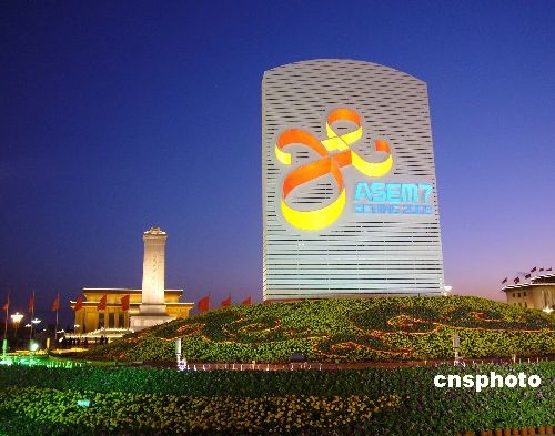 2008年10月23日傍晚,北京天安門(mén)廣場(chǎng)燈火通明,夜色璀璨。第七屆亞歐首腦會(huì)議標(biāo)識(shí)在五色燈光照射下,更加醒目美麗。中新社發(fā) 玉龍 攝