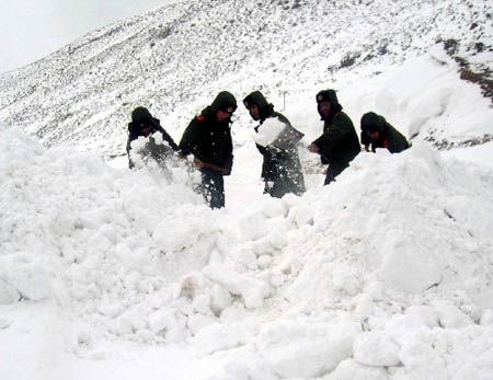 受持續(xù)強降雪和雪崩影響,川藏公路西藏境內(nèi)東達山至牛踏溝部分路段交通中斷。擔(dān)負(fù)川藏公路竹東段養(yǎng)護保通任務(wù)的武警交通部隊緊急啟動搶險預(yù)案,出動機車、兵力趕赴受災(zāi)現(xiàn)場全力搶通道路。 新華社記者 葉輝 攝