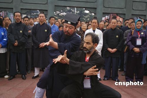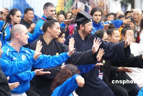 10月29日,第三屆世界傳統(tǒng)武術(shù)節(jié)在湖北十堰市舉行,來自69個(gè)國家和地區(qū)的165個(gè)代表隊(duì)的2000多名武術(shù)愛好者匯聚湖北十堰。當(dāng)日上午,來自世界各地的洋弟子們在十堰市人民廣場拜武當(dāng)派第14代掌門、武當(dāng)派武術(shù)的代表人物游玄德道長為師,并進(jìn)行武術(shù)表演。中新社發(fā) 稅曉潔 攝