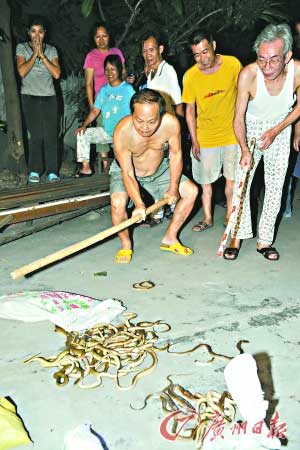 江先生緊緊盯住過道上的麻袋,只見張開的袋口中猛的躥出兩條蛇,緊接著,蛇一條接著一條地地爬出,向四周爬行。江先生嚇得一邊大叫“有人放毒蛇呀”,一邊往樓下跑。不一會(huì)兒,被驚出的街坊們跑出家門,大家拿起手邊的竹竿、掃帚、拖把,毫無(wú)章法地亂砸著地面。