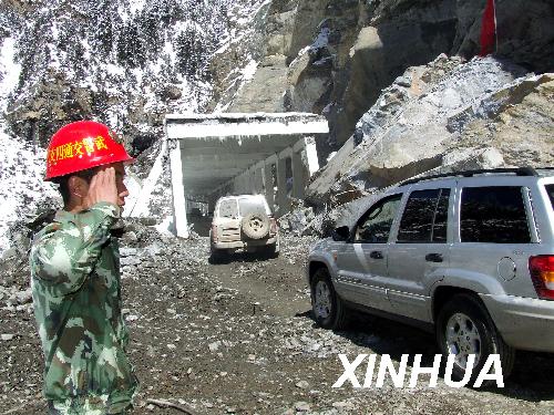 車輛通過川藏公路疏通的路段。
