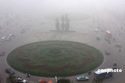 10月30日,江蘇連云港華聯(lián)廣場車輛在大霧中緩慢行駛。當天,江蘇連云港遭遇一場大霧襲擊,霧大的地段能見度不足50米,境內(nèi)的高速路全部關閉,影響了市民正常出行。中新社發(fā) 穆道勇 攝