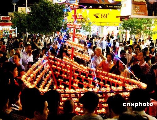 十月三十日晚,媽祖故鄉(xiāng)福建莆田舉行“點(diǎn)燭山”祈福活動(dòng),吸引眾多當(dāng)?shù)厥忻褚约扒巴鶇⒓拥谑畬娩刂迡屪嫖幕糜喂?jié)的賓朋觀看。中新社發(fā) 劉可耕 攝